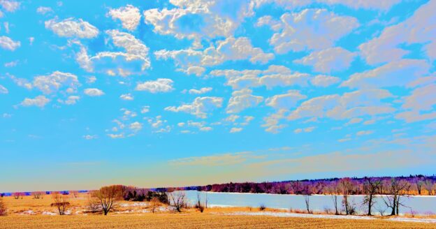 Whatever one’s musical preference, today is an ideal day for coffee and contemplation. Or, as in my case, for chilled herbal tea and a side of organic apple sauce with sour cream. Either way the view off the balcony is spectacular: the burgeoning river, farm fields of stubble (the snow is gone except in the tiny valleys or upon the shoals along the water’s edge), the parades of Canada geese honking overhead, an azure dome and brilliant sunshine.