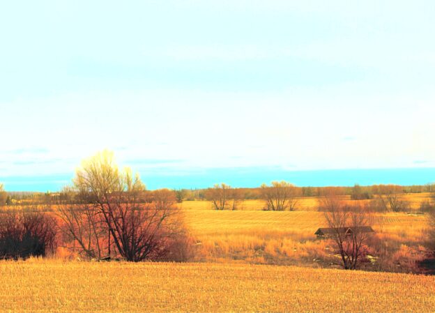 The three women whom I encountered independently throughout my sojourn each echoed my ebullience surrounding the upcoming change of weather. Back home sitting at my desk overlooking the field and upriver, it appears that all the snow (with the exception of the drifts hidden among the brush and reeds along river shoreline) has evaporated. The parallel furrows in the distant farmland are more pronounced without the common layer of white snow. Indeed the bland uniformity of the snow-covered fields has been replaced by the contrasting colours of late autumn, a tarnished mixture of yellow, orange and black. And when the late afternoon sunshine glanced along the river and speared across the brittle cornstalk stubble in the field, a brilliant golden boulevard of light brightened the view.