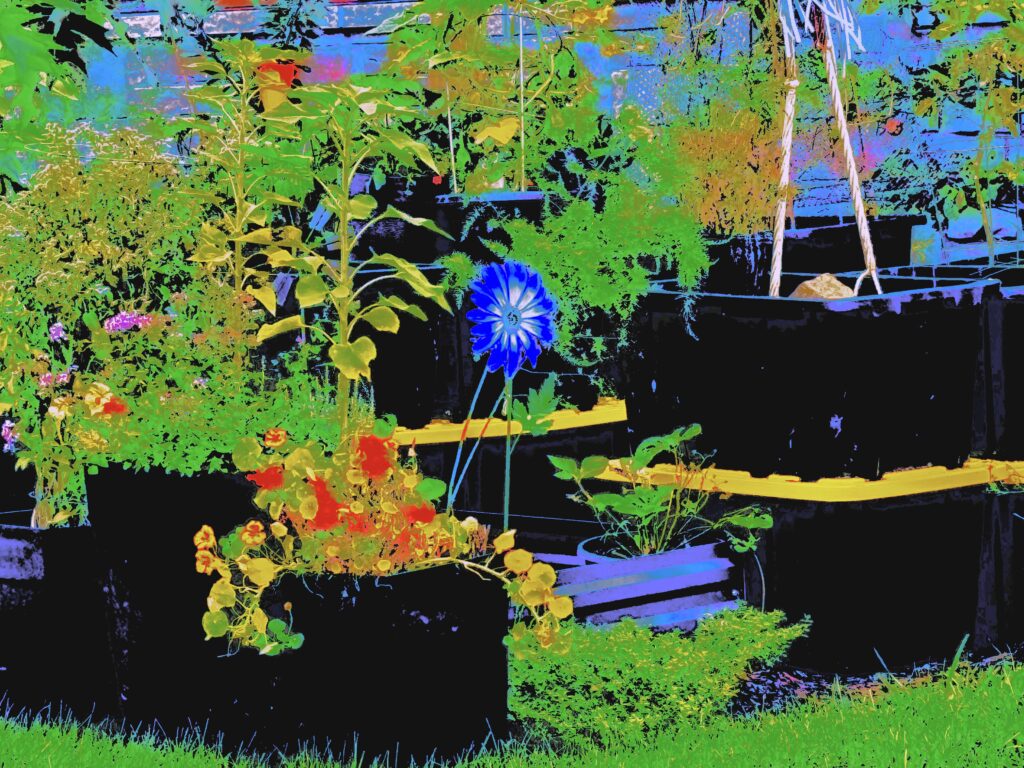 Attracting a less mournful state of affairs is today’s balmy summer air. Added to the this mid-August weather was a productive cycle in the neighbourhood when by chance I came upon a collection of blossoming flowers. I can only imagine it was thanks to the cloudy sky shading the dazzling sunshine that I was enabled on this occasion to catch a glimpse of these bountiful plants as I slipped by upon my tricycle. The home owners clearly devote considerable effort to the maintenance of their gardens. Most frequently I have seen the property owners aligned with rakes and hoes or more judiciously upon their hands and knees attending to the grounds and growth.