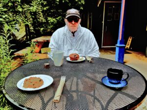 Today is Sunday, Canada Day weekend. When we arrived on the property at 8:30 am there were no others already seated, neither inside nor outside. I wondered whether it were superfluous to have emailed the café last evening to request a reservation for two. The Proprietor Mark Enright had dutifully responded to my request at 2:30 am this morning – apologizing for his anticipated absence from the scene upon our arrival. In his stead – or should I say, on his behalf – we were attended at table by his young daughter who informed us of her successful graduation to 2nd year studies at Carleton University and her pending location to an apartment near Dow’s Lake and the university.