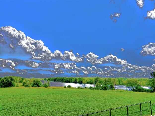 A cathartic spume spread upon the terrestrial environment today. Everything appeared calculated to render a freeing nature to the day. The morning grey cosmic masses incrementally dissolved beneath a light blue sky and fleeting white billows. The corn stalks continued their upward surge, shimmering green in the light wind and mounting brilliant sunshine.