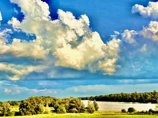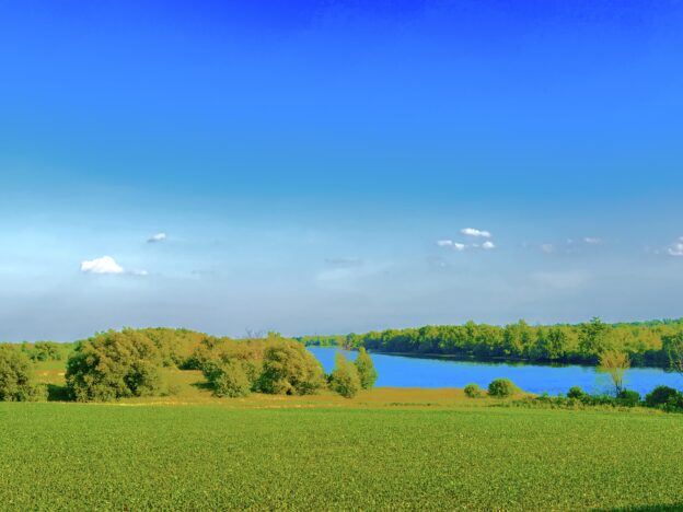 The emerging cornstalks flutter like feathers in the strolling wind as it sometimes streaks with impromptu gusto across the fields. The entire landscape adjacent the river is an image of green and blue, the tall trees in the distance flailing back and forth, exposing their whiteish undergarments as they writhe and rebound beneath the blue sky. The clarity of the air is my background nourishment today as we approach the Summer Solstice this evening.