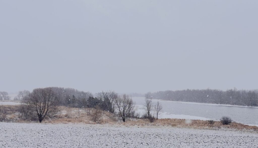 And now at last, late in the afternoon, beneath a drizzly grey sky, I have recovered my cushioned wooden chair at my desk overlooking the dreary landscape and frosty river. This, with the benefit of fruit and cashew butter, enhanced my espresso.