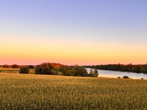 From the open balcony door the wind caught my ear. I raised my eyes from what I was reading – Les Miserables (1862) de Victor Hugo “Un texte du domaine public. Une édition libre. BIBEBOOK www.bibebook.com”) – to a sea of drifting cornstalks; and in the distance the faded base of shimmering upturned leaves. The whole was nonetheless critically defined, contrasting perhaps its mixture of golden verdancy with the dome of blue sky and the ribbon beneath of a meandering saddened river.
