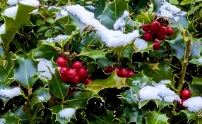 Today is December 1st. It marks the first snowfall of the season. We had just returned home from Dim Sum at Sea King Shark Fin Seafood Restaurant on Merivale Road in the city when the ghostly flakes began to materialize in the misty grey atmosphere. Of a sudden we turned the hibernal corner! Equally precipitous was the thought of glossy green holly bush leaves with their spikes and brownish stems supporting a cluster of red berries. It is for me the picture of Christmas. The memory hearkens back to my earliest childhood at Sunday school when I heard for a first time the lyrics of The Holly and the Ivy the traditionally British folk Christmas carol.