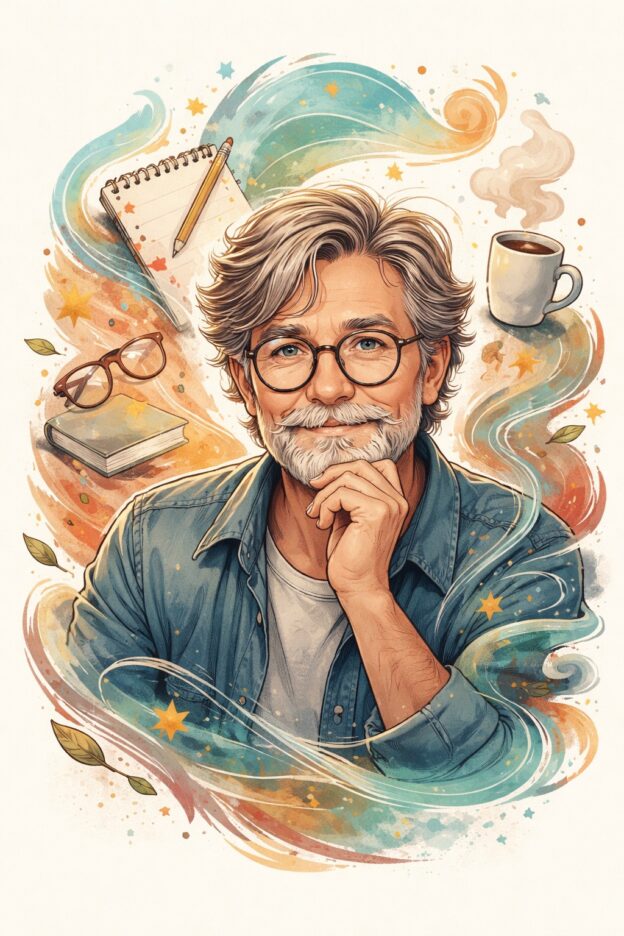 The silver hair and thoughtful expression weren’t about age. They were about depth. The notebook and coffee weren’t props. They were symbols of reflection. The swirling colors were meant to suggest an active inner world, not noise, but motion.
