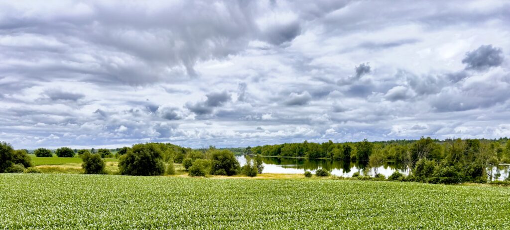 The river is placid today. A mirror stretches throughout as though poured like a shining liquid then frozen in place. The 44°NE wind of 3 km/h is unnoticeable. There is a subdued reflection of the lush growth along the southern shore of the river. In the adjacent corn fields the stalks tower to the heavens. Their preponderance blankets the horizon. Everywhere is green.