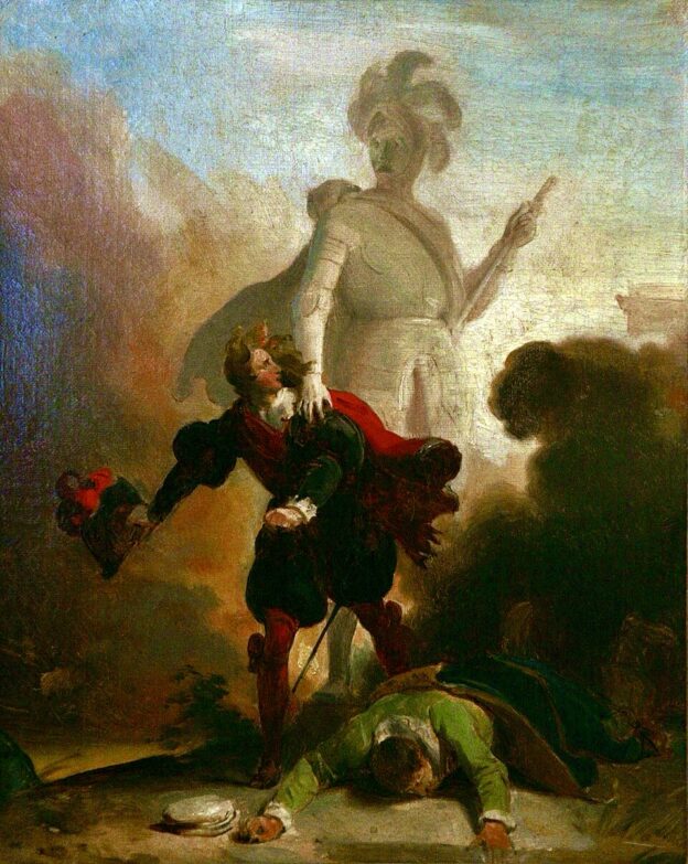 Don Giovanni (1787) is a Mozart opera combining comedy, melodrama, and supernatural elements, detailing the final days of a reckless nobleman, Don Juan (Giovanni). After murdering the Commendatore, Giovanni pursues endless romantic conquests, only to be confronted and dragged to hell by the statue of his victim. Giovanni finds himself in a cemetery, where he audaciously invites the statue of the dead Commendatore to dine with him. The statue accepts and, when Giovanni refuses to repent for his wicked life, drags him down to Hell.