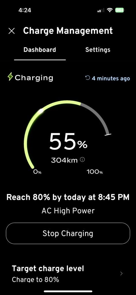 Part of our focus today was to see how far we could go with our new EV (Electric Vehicle) on a full charge. Last evening I modified the MyCadillac App to charge to 100% which I recall gave us this morning prior to departure 555Km. We’re now almost home again and the car reports 298Kms remaining – which, upon having plugged the car in again immediately upon our return to charge to 80% (the recommended target charge level) – approximately matches the information that at 50% charge the anticipated distance is 300 Km (approaching the 555Km or 600Km model when rounded up for convenience to 100%).