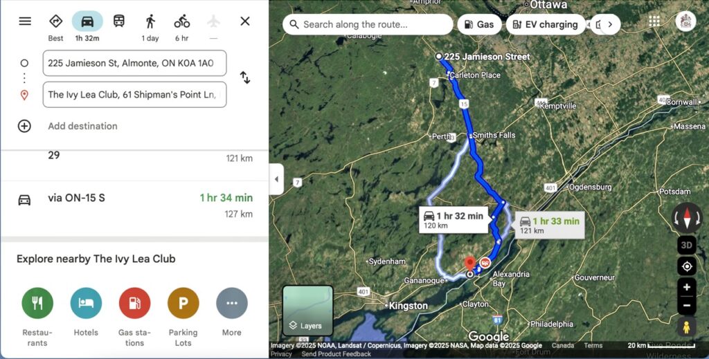 If it took us 1½ hours each way, to and from the Ivy Lea Club, that would consume 3 hours total to cover about 250Km. We lingered briefly at the Ivy Lea Club on this occasion (we hadn’t an appetite for lobster rolls). The subsequent diversion to Prescott (where we had intended to go to Katarina’s Café for an espresso but didn’t find a suitable parking space) added several minutes to the total, nicely accommodating the cumulative total of 4 hours since our departure this morning. Disregarding the hour for toddling and delay, the important feature is that the car (when fully charged) is good for about 6 hours or 500Km (which is the most we normally travel in a day so it would not inhibit a subsequent overnight charging at a hotel for example).