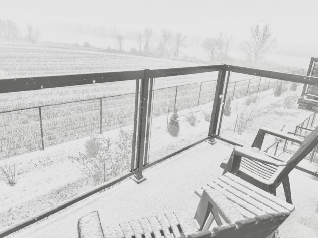 For the past several days people everywhere have been chatting energetically about it. The Snowfall Warning continues until daybreak tomorrow. About a week ago there was an early morning frost that resembled a skiff of snow; but today’s forecast is far less ambivalent. Already the harvested field is more defined as the white snow covers the earthly remains of the mutely coloured stalks. Meanwhile the faded stumps protrude from the snow like an army of perfectly aligned constituents. Today’s blast is the first snowfall of the season.