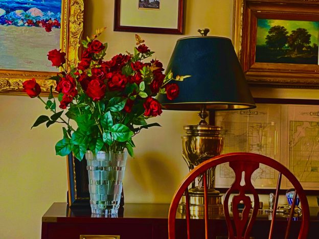 It’s late in the day on a Thursday afternoon. Outside the air is cold. I am projecting through the drawing room sheers over the head of my limited edition (2/25) bronze sculpture Îrhe Wapta by Don Begg. The horizon is a mixture of grey and white, a prolonged and erratic tarnish upon the sky. The vermillion roses blend among the dark emerald leaves and in a bold and exuberant proclamation stem from the elaborate Lalique vase. Roberto Cacciapaglia mists the apartment.